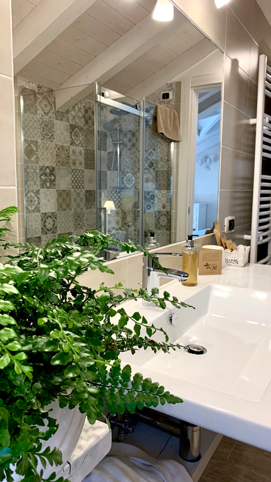 Bagno privato con finestra (8 mq), doccia a filo pavimento con pareti di cristallo temperato, lavabo con piano d'appoggio ed ampio specchio sovrastante;