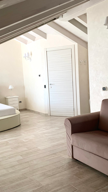 Le zone letto, molto luminose, sono dotate di materasso idrocell in memory, tv lcd satellitare, poltroncina e/o divano letto, biancheria in cotone percalle, doppi cuscini anallergici, frigo bar free con mini assortimento di bevande e snack, ferro da stiro completo di mini asse, scrittoio-consolle, armadio e cassettiera, comodini con prese vicino al letto, riscaldamento idrotermico autonomo con pellet di legna e produzione di acqua calda con pannelli solari, aria climatizzata, free wifi, porta finestra per l'accesso alla terrazza privata con vista mare monti, completa di sedie e tavolino, sedia a dondolo e lettino prendisole.